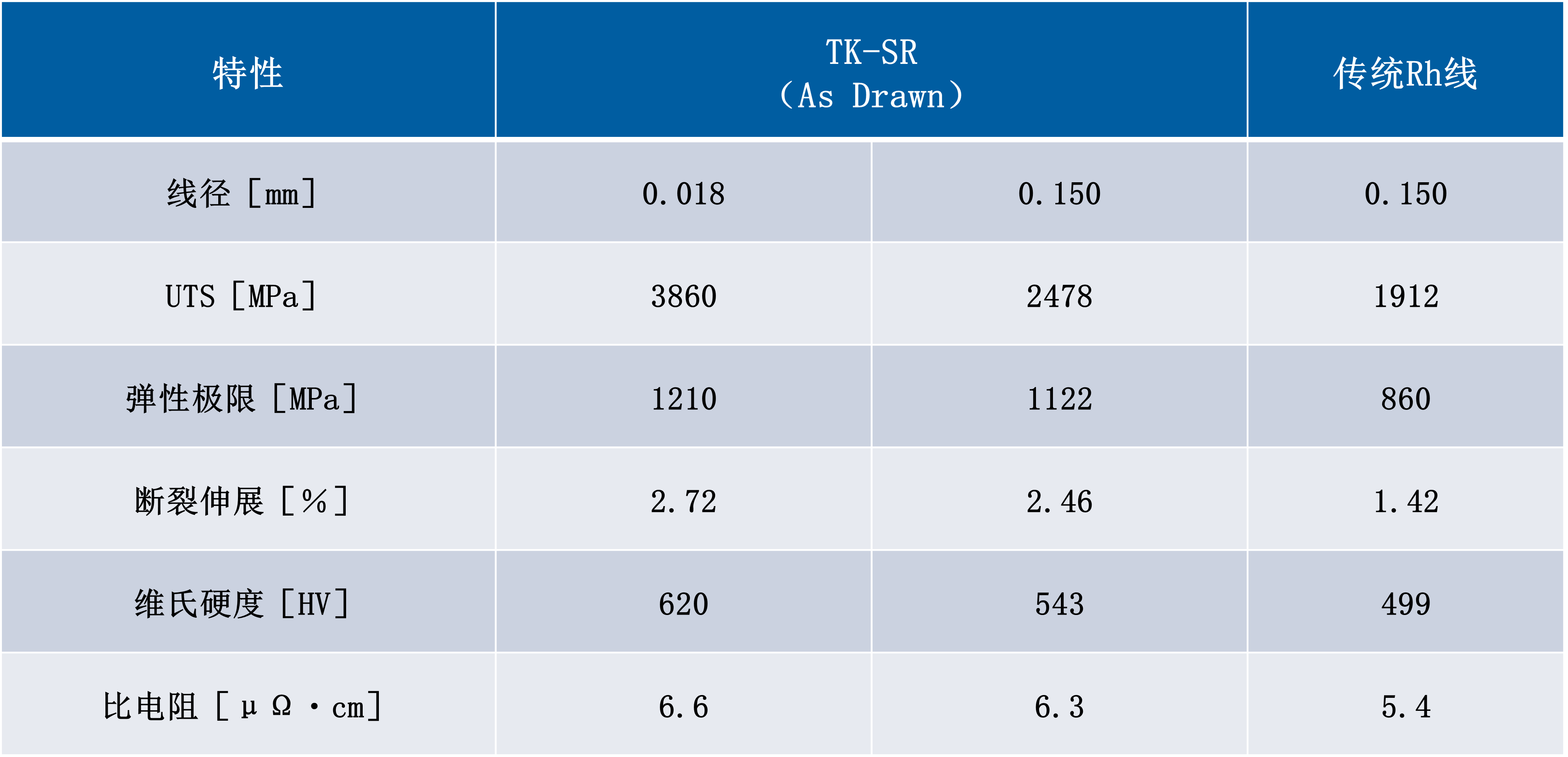 TANAKA为半导体制造的前段和后段工艺中使用的检测设备,制造并提供各种贵金属探针材料。本次发布的“TK-SR”作为探针用铑材料,可同时实现传统探针用材料无法实现的更高强度、更高弹性极限、更高硬度、更高导电率,因此预计可显著延长探针卡的使用寿命并降低成本。