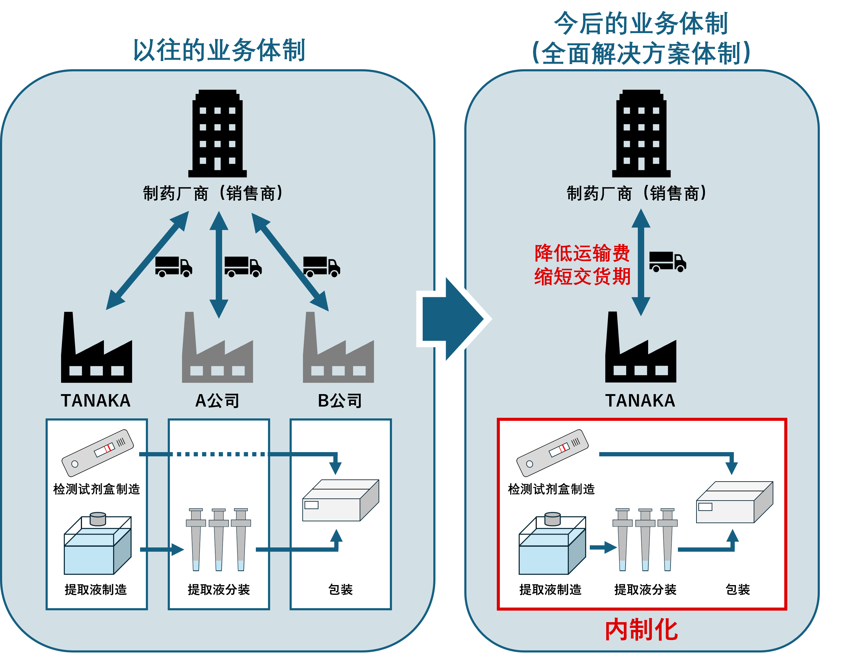 通过此次确立的全面解决方案体制,我们实现了从检测试剂盒开发制造,到提取液的批量制造及分装、包装等各工序的一站式受托服务。由此不仅能够对客户从开发阶段到量产的过程持续提供支持,还能应对仅药液分装等单一工序的委托