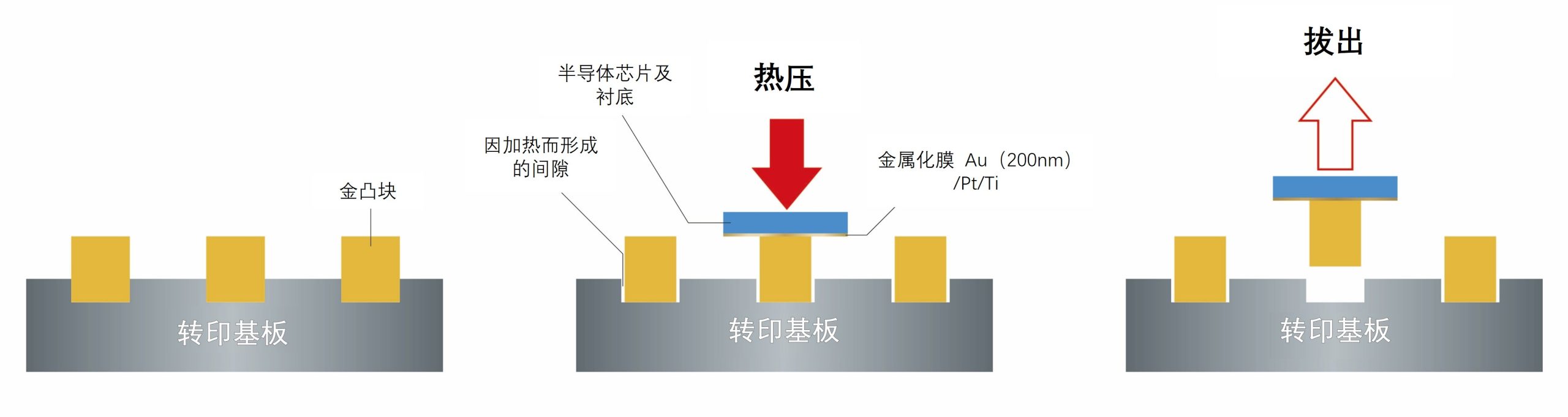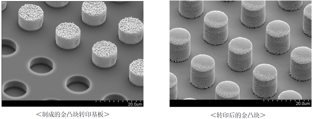 - 将想要形成金凸块的对象(半导体芯片及衬底)对准转印基板,进行10MPa、150℃、1分钟的热压。随后垂直抬升基板,即可完成金凸块的转印