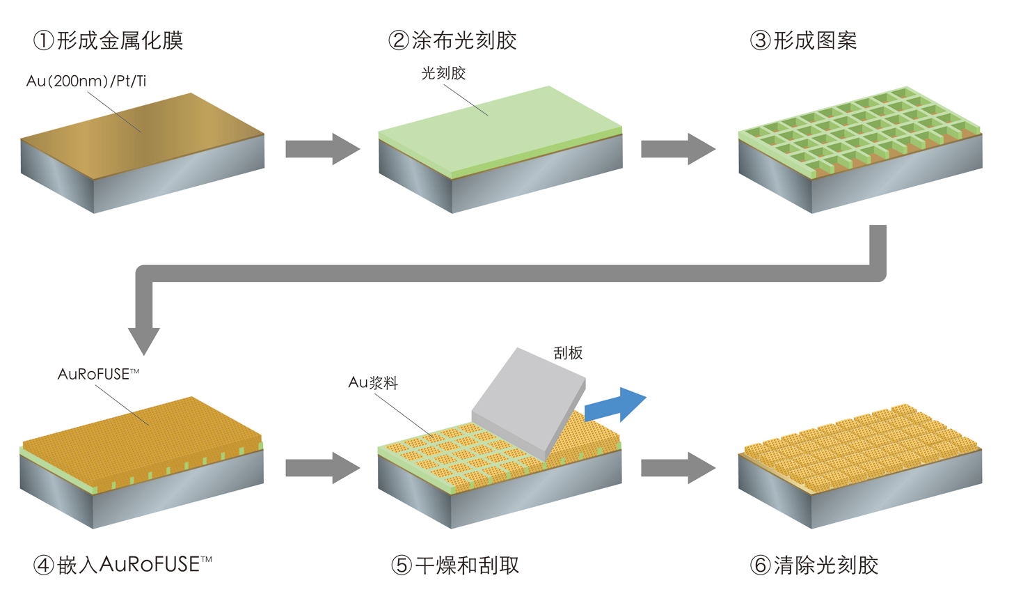 - 在常温下真空干燥AuRoFUSE™,并刮取光刻胶上多余的金浆料